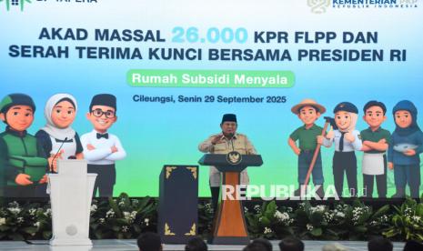 Presiden Prabowo Subianto memberikan sambutan pada acara akad massal KPR Sejahtera FLPP dan serah terima kunci di Perumahan Pesona Kahuripan 10, Cileungsi, Kabupaten Bogor, Jawa Barat, Senin (29/9/2025). Kementerian Perumahan dan Kawasan Permukiman (PKP) menggelar akad massal sekaligus serah terima 26.000 unit rumah dalam program Kredit Pemilikan Rumah Sejahtera Fasilitas Likuiditas Pembiayaan Perumahan (KPR FLPP) kepada 17 segmentasi perwakilan masyarakat berpenghasilan rendah (MBR) sebagai bagian dari komitmen dalam menyukseskan program Tiga Juta Rumah yang dicanangkan presiden. (FOTO : ANTARA FOTO/Indrianto Eko Suwarso)