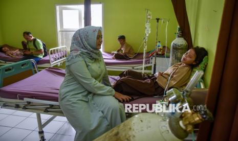 Orang tua mendampingi anaknya saat dirawat di Puskesmas Kawali, Kabupaten Ciamis, Jawa Barat, Jumat (3/10/2025). Sebanyak 16 siswa dari SD Negeri 1 Sindangsari, MI PUI Pogorsari, dan SD Negeri 5 Karangpawitan, mengalami keracunan yang diduga akibat menyantap hidangan Makan Bergizi Gratis (MBG). (FOTO : ANTARA FOTO/Adeng Bustomi)